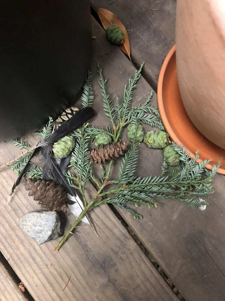These little neighbor girls gifted me green treasure, the seeds of everlasting giants. These seed pods still vibrant with chlorophyl and filled with their sticky rich sap. These seeds hold the potential of growing to be the tallest and oldest living organisms on the planet, reaching over 300 feet and to be over 2,000 years old. These trees that resist fire and insects and rot and human destruction, our climate change heroes that cleanse more CO2 than any other tree in the world. Trees that hold moisture-rich fog in their tissues and capture smoke from the air, raining life into their under-stories. Trees that are as old as the dinosaurs (almost).